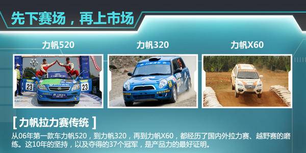 普及下力帆的拉力赛历史。从06年第一款车力帆520,到力帆320,再到力帆X60,都经历了国内外拉力赛、越野赛的磨练。这10年的坚持,以及夺得的37个冠军,是产品力的最好证明。先下赛场,再上市场,于是力帆X50参加了2015年的汽车拉力赛。