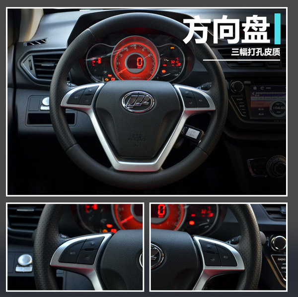 方向盘采用三幅打孔皮质包裹的设计,方向盘左右两侧集成了6个多功能按键,左侧为音量调节,右侧为模式切换。