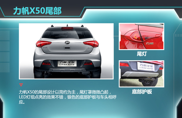 力帆X50的尾部设计以简约为主,尾灯罩微微凸起,LED灯组点亮的效果不错,银色的底部护板与车头相呼应。