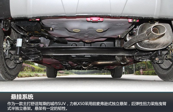作为一款主打舒适驾乘的城市SUV,力帆X50采用前麦弗逊式独立悬架,后弹性扭力梁拖曳臂式半独立悬架。悬架有一定的韧性,在过弯时能对侧倾起到抑制作用,处理较大起伏时没有多余的弹跳,表现不错。