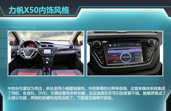 力帆X50的内饰风格以运动为主,全黑色的中控面板使用大面积的硬质塑料覆盖,不过对于这个级别的车型可以理解。中控台布置较为简洁,多处使用小幅镀铬装饰。