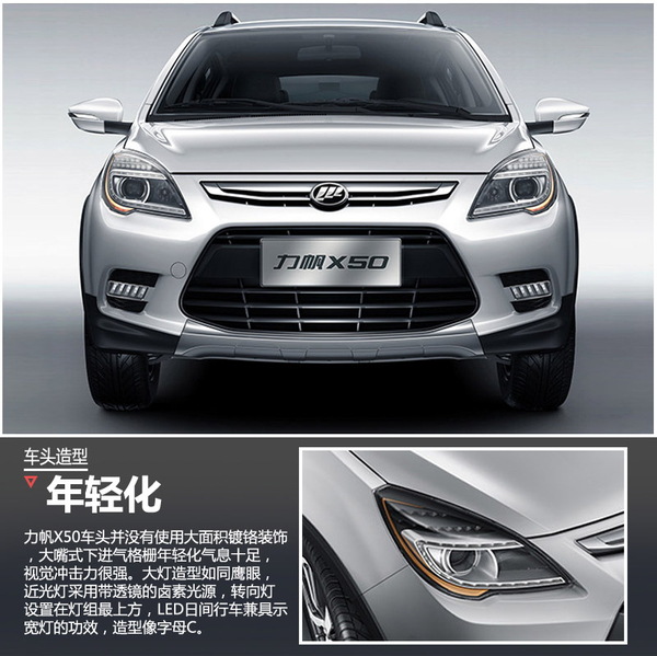 力帆X50车头并没有使用大面积镀铬装饰,大嘴式下进气格栅年轻化气息十足,视觉冲击力很强。大灯造型如同鹰眼,近光灯采用带透镜的卤素光源,转向灯设置在灯组最上方,LED日间行车兼具示宽灯的功效,造型像字母C。
