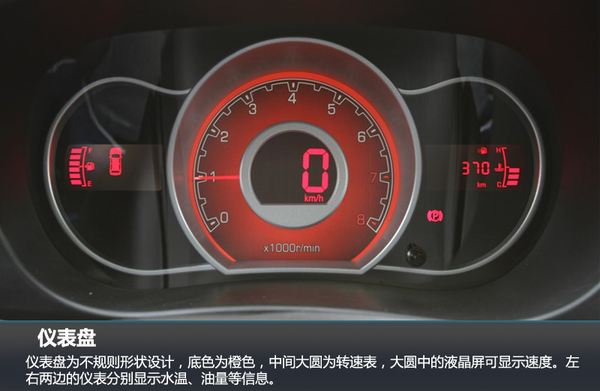 仪表盘为不规则形状设计,底色为橙色,中间大圆为转速表,大圆中的液晶屏可显示速度。左右两边的仪表分别显示水温、油量等信息。