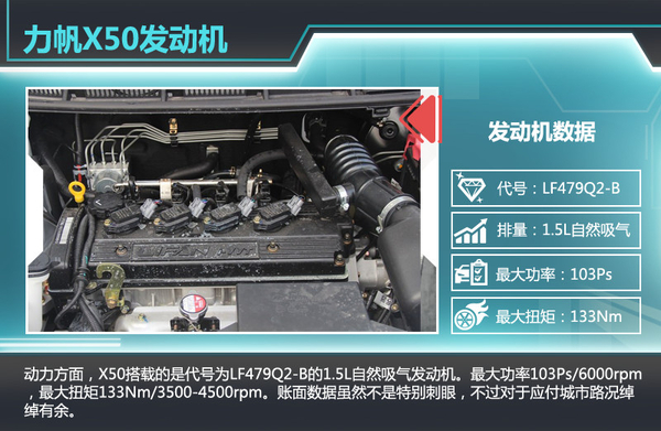 动力方面,X50搭载的是代号为LF479Q2-B的1.5L自然吸气发动机。最大功率103Ps/6000rpm,最大扭矩133Nm/3500-4500rpm。账面数据虽然不是特别刺眼,不过对于应付城市路况绰绰有余,而且油门设定有点日系范,轻踩踏板就有加速感。与发动机匹配的是5速手动和CVT无级变速箱。工信部综合油耗数据显示,手动挡车型百公里工况综合油耗为6.3L,CVT车型的油耗为6.5L。