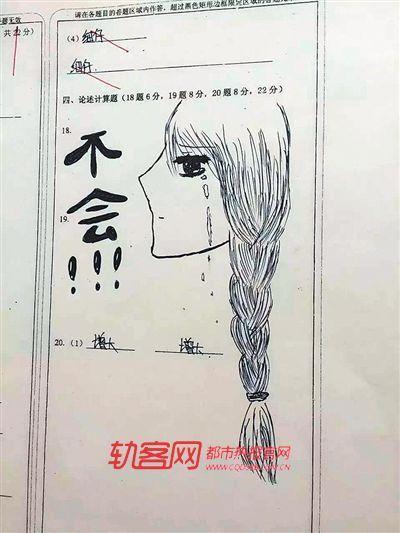 女生画画求原谅  女孩答不出题,画漫画求原谅  近日,大石化某中学初三年级某班班主任王老师在自己的微信朋友圈晒出一张:一张测试卷上画着一个扎着大辫子的泪眼婆娑小女生,旁边写着“不会”,并附上三个感叹号