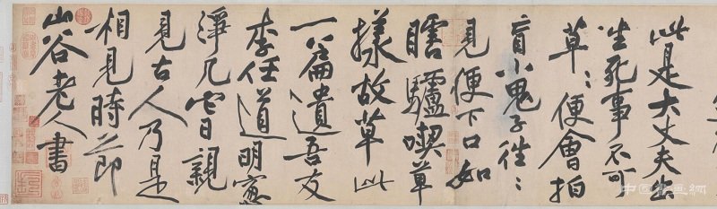 《诸上座帖》,北宋/约1100年,黄庭坚,纸本墨笔,手卷,纵33厘米,横729.5厘米,北京故宫博物院藏  《草书诸上座帖卷》约作于哲宗元符三年(1100年),凡92行,477字。该书是黄庭坚为其友李任道抄录的五代《文益禅师