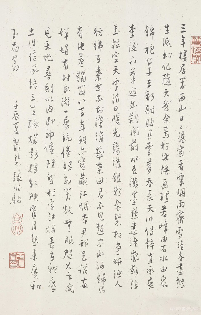 张伯驹行书题跋王诜《渔村小雪图》释文:  三年楼居X西山,日日凭窗看云烟。雨霁雪晴各尽态,生灭幻化随天然。余焉于此悟画理,若峰由石水由泉。锦袍公子王都尉,胸具云梦吞长天。川传钵直承展李,后上