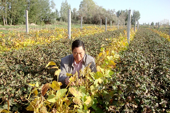 韩天富在民勤县双茨科乡查看棉花套种中黄30长势情况
