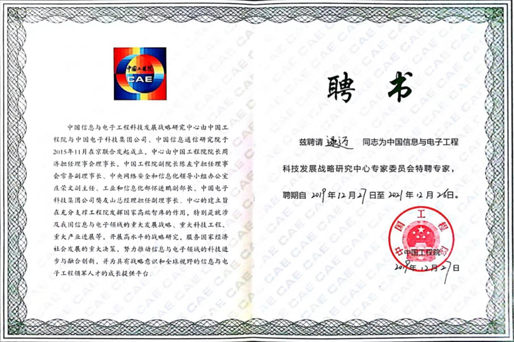 大会期间,向新聘专家颁发了由中国工程院签发的聘书,我校逯迈教授被聘为中国信息电子与工程科技发展战略研究中心专家委员会特聘专家。
