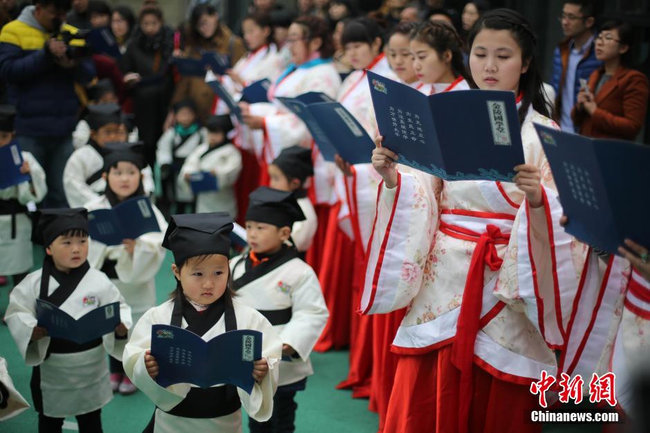 3月13日,南京市浅草幼儿园105名刚入学的小萌娃们在金陵国学堂的老师带领下,着汉服行古礼,拜圣人诵孝经,写人字学感恩举行了一场别开生面的人生“开笔礼”。同时在现场还向南京及周边城市3-12岁的少年儿童发出一起来参加今年的“国韵宝贝六一晚会”的邀请,共同体味传统文化的韵味。 记者 泱波 摄