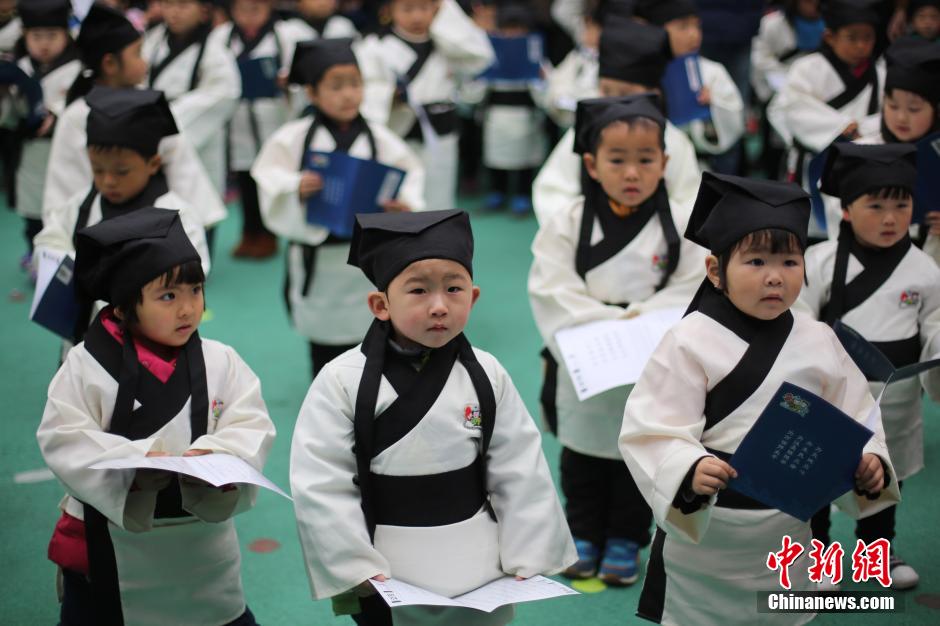 3月13日,南京市浅草幼儿园105名刚入学的小萌娃们在金陵国学堂的老师带领下,着汉服行古礼,拜圣人诵孝经,写人字学感恩举行了一场别开生面的人生“开笔礼”。同时在现场还向南京及周边城市3-12岁的少年儿童发出一起来参加今年的“国韵宝贝六一晚会”的邀请,共同体味传统文化的韵味。 记者 泱波 摄