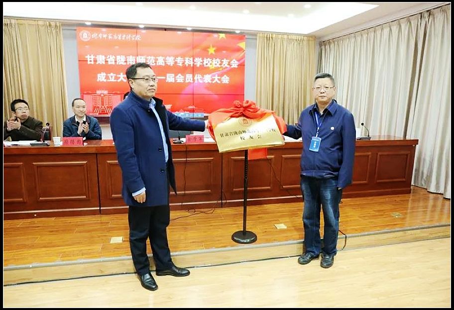 陇南师专校党委书记余学军和兰州城市学院副校长莫超为校友会揭牌。杨军供图