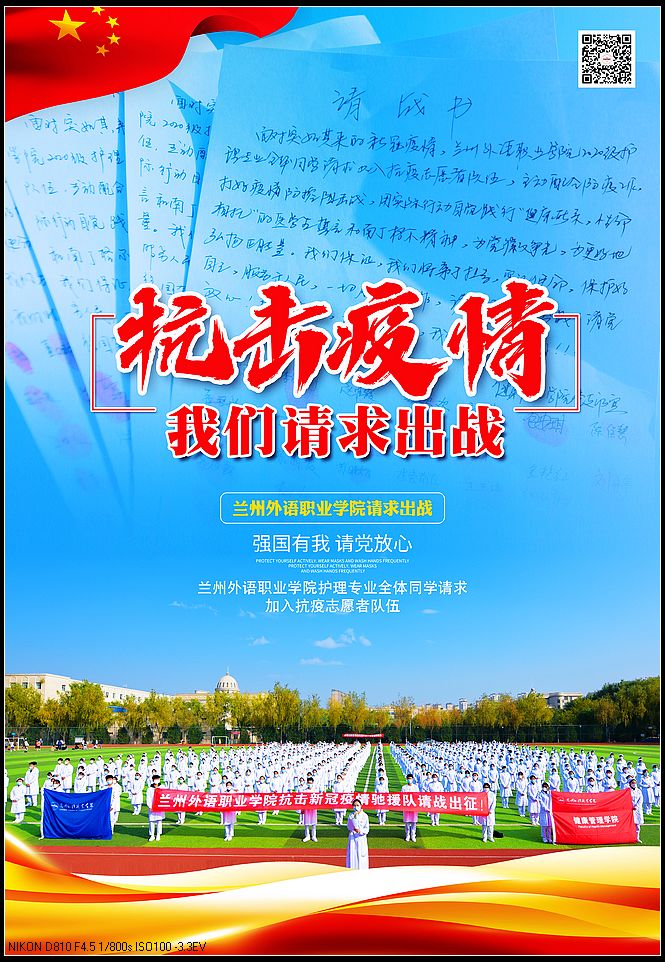甘肃兰州 20211023 面对突如其来的新冠疫情,兰州外语职业学院2020级护理专业全体同学请求加入抗疫志愿者队伍,我们将勇于担当,牢记使命,保护好自己,服务人民,一切服从安排,请允许我们出战,请党放心,强国有我,我们准备着,我们时刻准备着!