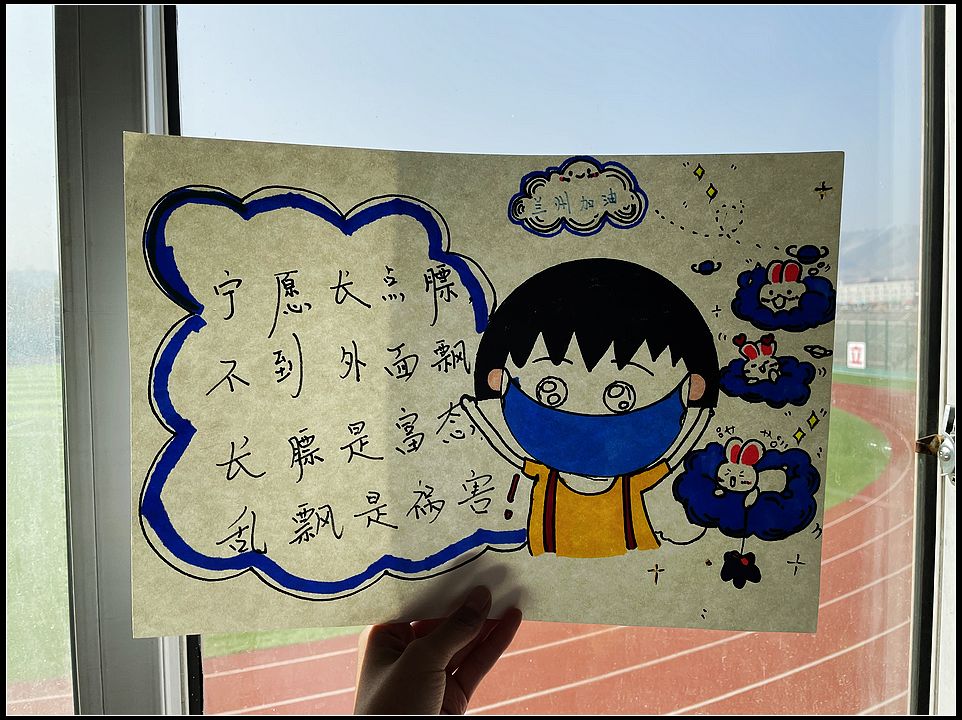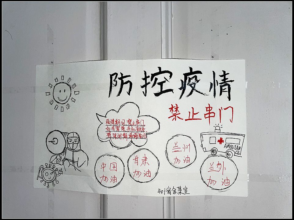 近期甘肃疫情牵动着全国人民的心,为了保障师生健康安全,兰州外语职业学院实行封闭式管理。在这特殊时期,兰州外语职业学院2020级学前教育6班靳磊和她的同学们利用自己专业优势,手工制作疫情防护海报张贴至宿舍门口,倡导大家提高疫情防护,这一举动引发其他同学好评,纷纷模仿制作,这些作品各个紧扣防疫主题,想象力独特,宣传实用价值颇高,成为校园防疫战线上一道亮丽景观。