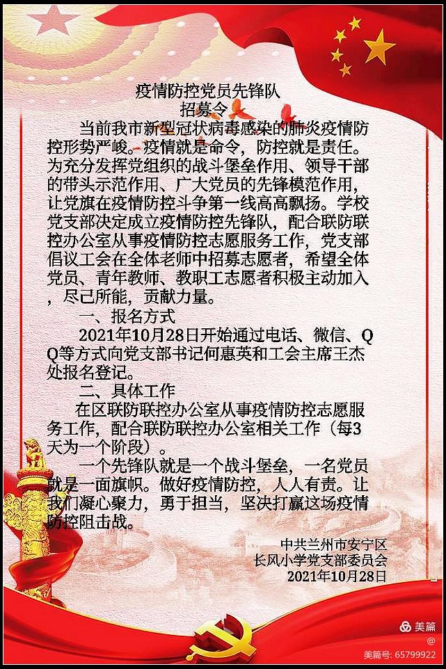 镜头三:当前兰州市新冠疫情防控形势严峻。疫情就是命令,防控就是责任。为充分发挥党组织的战斗堡垒作用、领导干部的带头示范作用、广大党员的先锋模范作用,让党旗在疫情防控斗争第一线高高飘扬。学校党支部决定成立疫情防控先锋队,配合联防联控办公室从事疫情防控志愿服务工作。我校党支部及工会向全校教师发出了招募令。