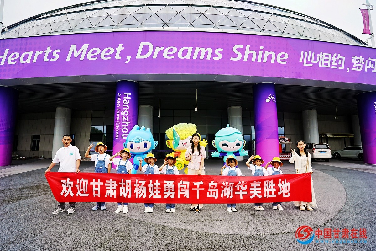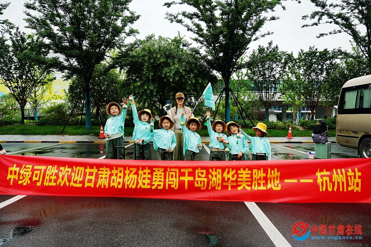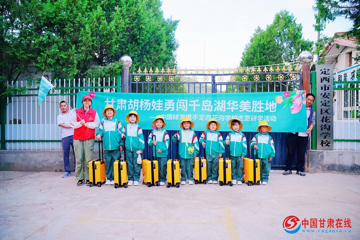 中国甘肃在线讯 6月10日,7个来自定西花沟学校的学生孩子身着统一的绿色工装套装、头戴黄色渔夫帽,各自拖着一个航天员行李箱,排着整齐的队伍向千岛湖进发。