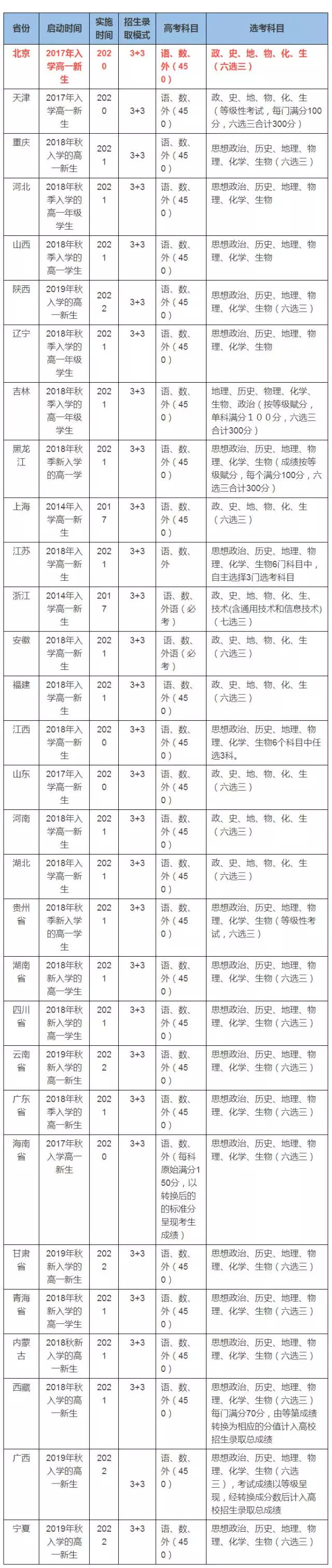 北京、海南、山东高考改革方案也将采用“3+3”模式,确定选考科目实施方案与上海类似,从思想政治、历史、地理、物理、化学、生物6个科目中自主选择3科。考生高考成绩将由语文、数学、外语3门必考科目的成绩与3门选考科目的成绩构成。外语同样提供两次考试机