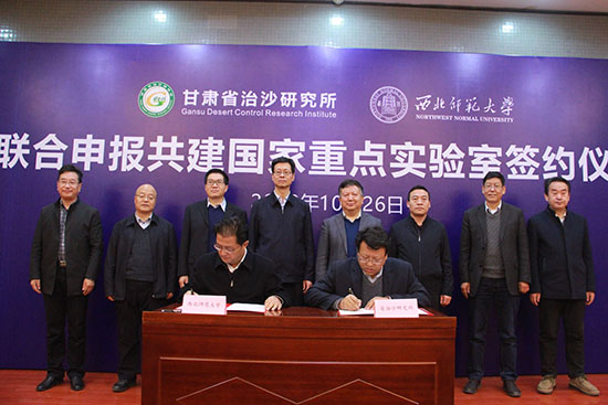 近日,西北师范大学与甘肃省治沙研究所签署联合申报共建国家重点实验室合作协议。西北师范大学校长刘仲奎、副校长董晨钟、副校长陈怡平和省林业厅副厅长樊辉、甘肃省治沙研究所所长徐先英、党委书记石建忠出席签约仪式。省林业厅科技处、省科技厅发展计划处、省教育厅科技处负责人参加活动。
