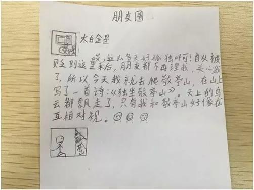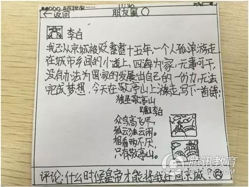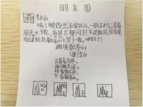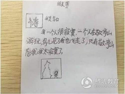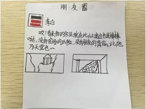 近日,浙江杭州长江实验小学语文老师徐明布置的一道语文“神作业”火了。为什么火?徐明老师的这道作业是这样的——模仿李白写“微信朋友圈版”的古诗读后感,在家长圈里被频繁转发。“学语文关键在于总结和感悟,但读后感的形式太过陈旧。把现在流行的微信结合在一起,一来,孩子们感兴趣,二来,总结课堂收获和感悟的目的达到了,三来,微信内容不长,还能够锻炼学生的概括能力。”徐明娓娓道来。老师爱创新,学生也脑洞大开!想知道大诗人李白在朋友圈都说了些啥?赶紧来看看吧。