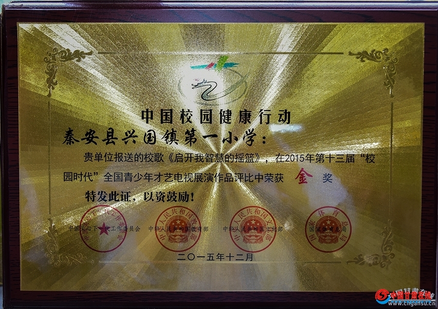 中国甘肃在线讯 (特约记者:陈治平)秦安县兴国镇每一小学始办于1905年,已有100多年的历史。学校占地面积13332.85平方米,有两幢教学楼,学校硬件设施非常完善,配有仪器室、实验室、图书室、阅览室、美术室、音乐室、舞蹈室、心理咨询室等设备设施,现有教学班机25个,在校学生1289人,教师57人,,其中省骨干3名,市、县骨干10名,中级职称15人,初级职称42人,学历达标率100%。