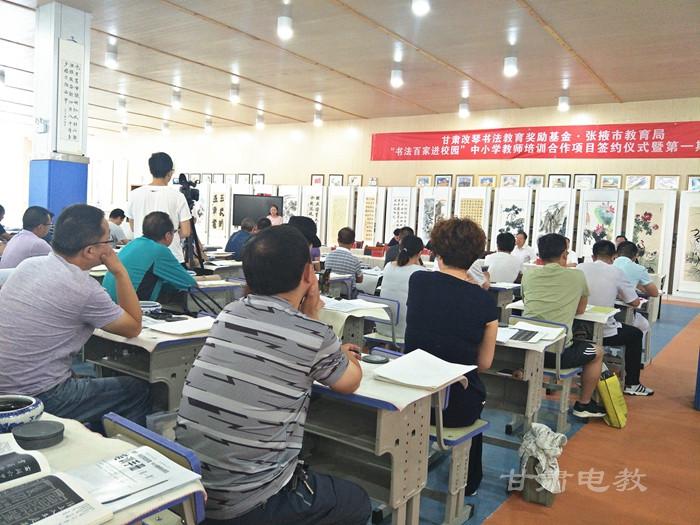 开班仪式上,甘肃改琴书法教育奖励基金会与张掖市教育局签订“书法百家进校园”中小学教师培训项目合作协议,旨在对该市中小学书法教师进行专业引领,提高书法教师的理论水平和实践能力,推进书法教师专业化发展。项目计划实施期3年,每年2期,每期5天。由甘肃改琴书法教育奖励基金会聘请省内外书法名家开展集中短期面授,每期培训书法种子教师60名,3年培训培养360名中小学书法种子教师。