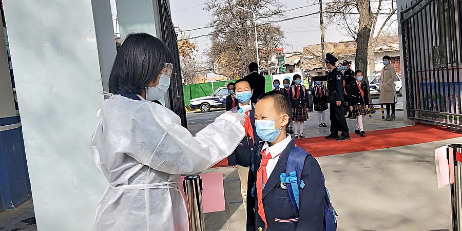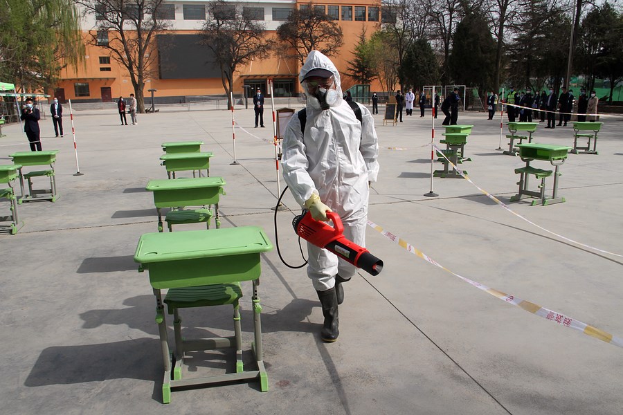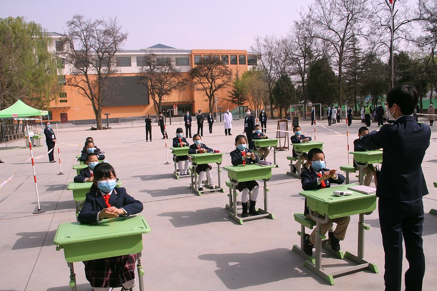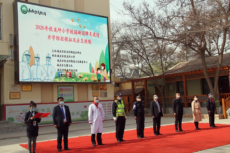 4月20日,是兰州市城关区根据疫情情况通知开学第一天,该校首开先河举办校园新冠肺炎疫情开学防控模拟及应急演练,模拟情景从学生入校消毒、安检、进校测温并登记,进入教室,进班复测。