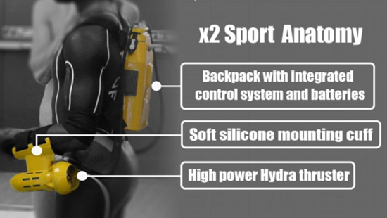 据悉,x2水下喷气发动机设备是一款“可穿戴的推进系统”,这套装备将双螺旋桨配戴在使用者手臂外侧,使用先进的锂电池和无线控制,锂电池续航可长达一个小时。该设备螺旋桨产生的强大推力能够促使穿戴者毫不费力的在水中穿梭。