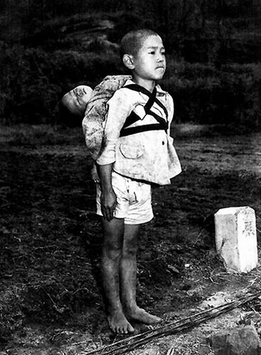 1945年,一个日本小男孩背着他死去的小弟弟,站在火葬的柴堆前。