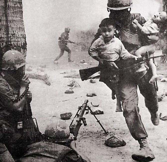 越南战场上,一名士兵不顾自己的生死,抱着两个小孩冲出战区。