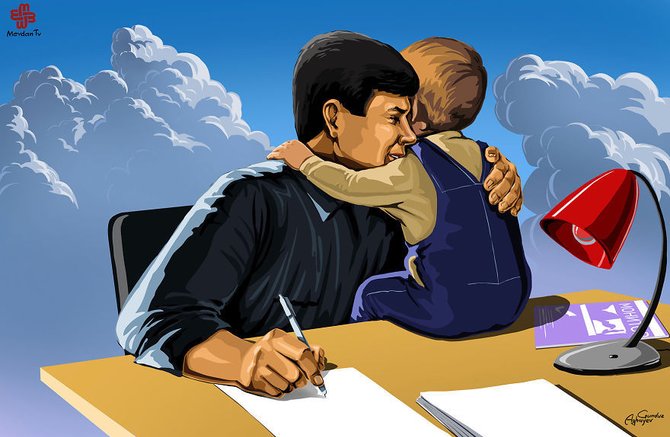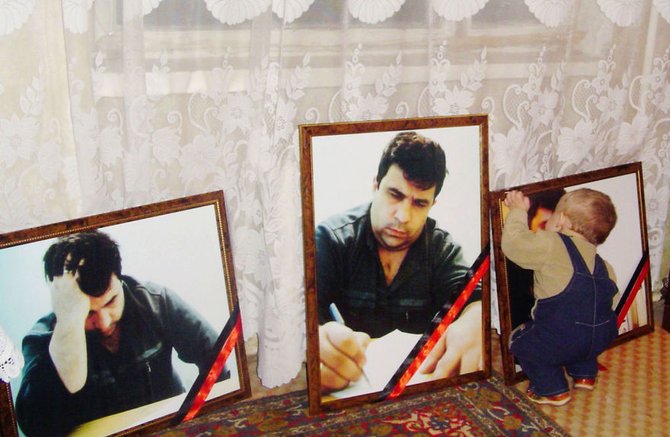 阿塞拜疆记者Elmar Huseynov长期批评总统阿利耶夫和他的父亲和前任总统阿利耶夫。他在2005日3月被谋杀。图片中,他的儿子还不知道父亲已逝,蹲在他的遗照前吻他。