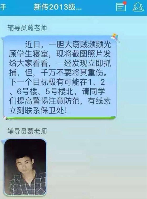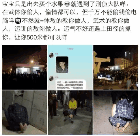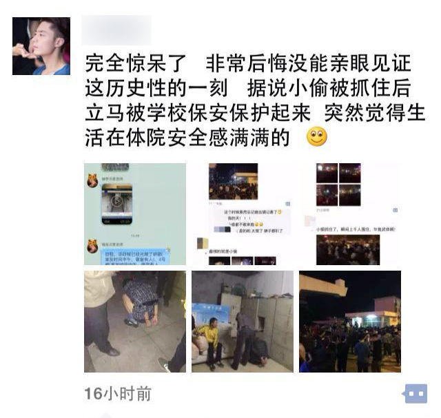 辅导员下午发的通缉令,学生们晚上就抓到了这贼,总算明白为什么辅导员提前通知大家别打成重伤了…拳击散打跆拳道各个专业都找到了练手的…林志玲啊何炅啊胡夏啊来的时候学校都没这么轰动过…空间刷屏了朋友圈炸了连小偷淘宝同款都出来了…学校西门也倒了…警车也被砸了…抓个小偷像过年