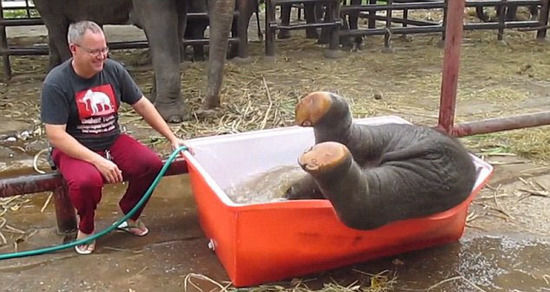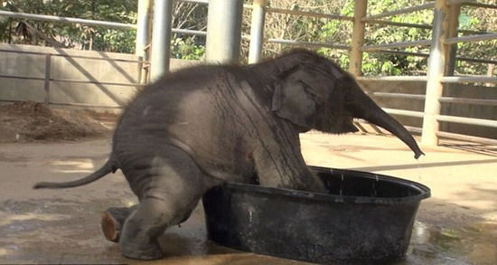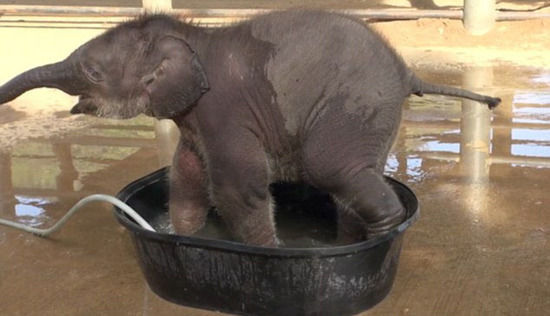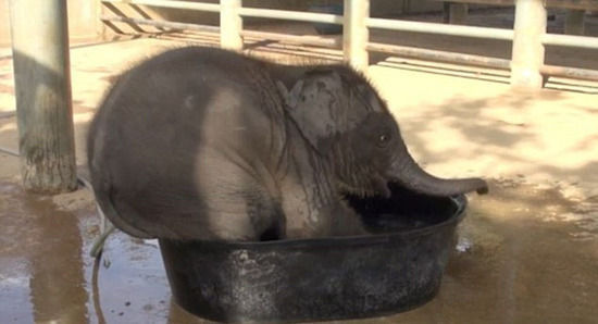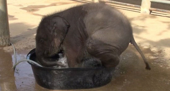 它 先是一头栽入浴盆,弄得水溅得到处都是。接着它将象鼻浸入水中,四只腿全部挤进浴盆挣扎着想要坐下来,无奈小小的浴盆并不足以容纳它巨大的身躯。这一举动 再次使得水花四溅,象宝宝见此情景愈加兴奋,一只后腿不停扑腾。当它多次尝试坐下却均以失败告终,它开始用鼻子喷水玩。