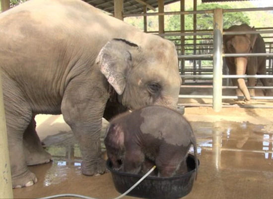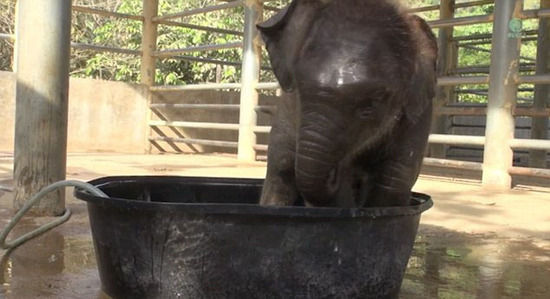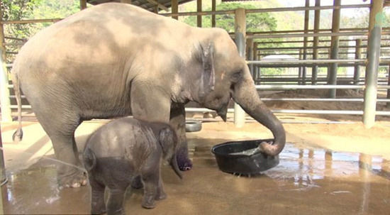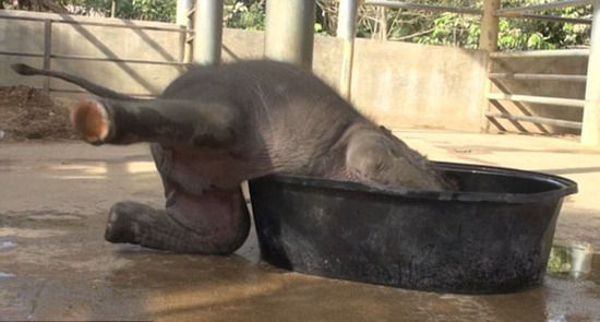 视频显示,当大象妈妈靠近浴盆,用象鼻连盆带象一起挪走时,小象十分惊慌。尽管象妈妈的行为让小象不慎滑了一跤,但只要看到心爱的玩物——浴盆,小象仍旧开心不已。