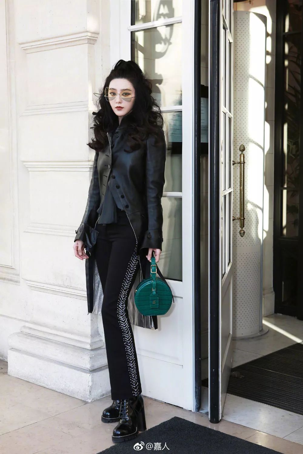 受邀担任早春秀观秀嘉宾,现身美秀美术馆的范冰冰着路易威登 2017春夏系列黑色皮衣与短裙,搭配黑色与monogram 短靴;金色珠片装饰Petite Malle小硬箱来自2017早秋系列。