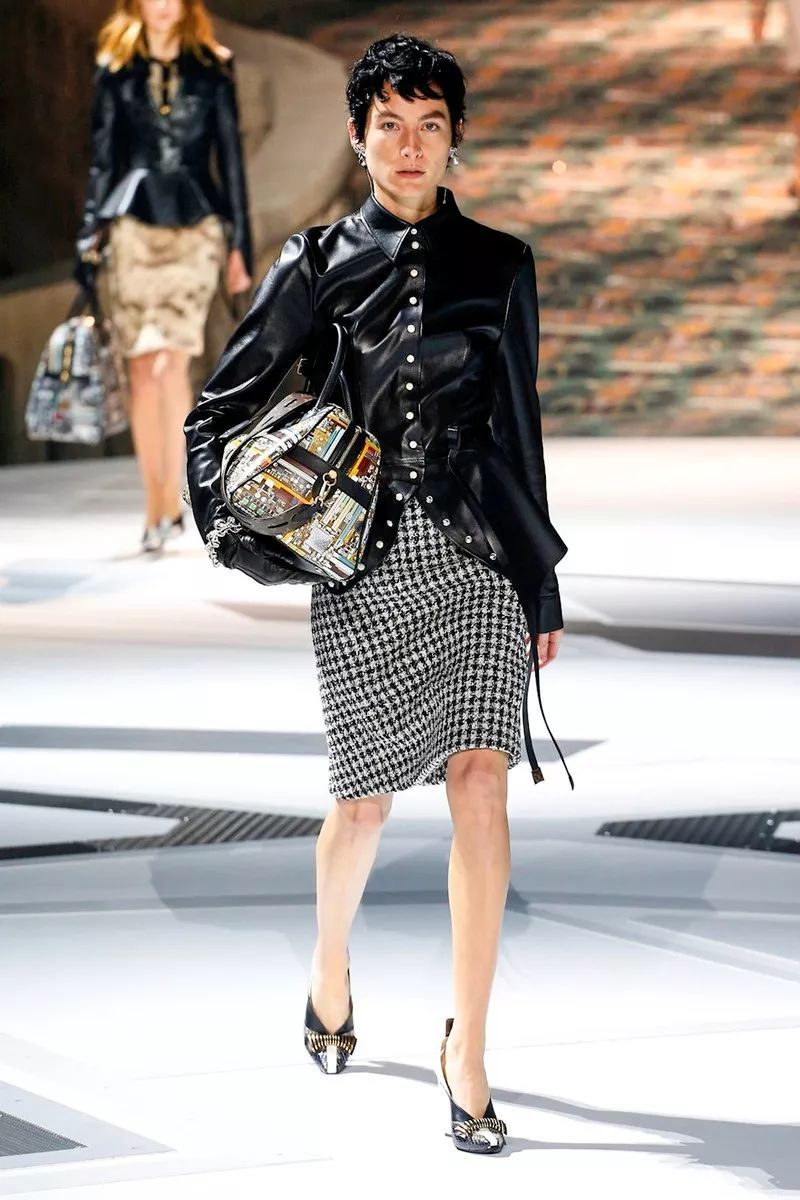 廓形皮革外套搭配复古丝质长袖衫、个性烟管裤、高科技面料V字高跟凉鞋和绿色鳄鱼皮PETITE BOITE CHAPEAU手袋均来自路易威登2018春夏系列。