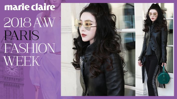 2018春夏巴黎时装周,范冰冰变身未来女战士,着路易威登2018早春系列黑色套装,搭配黑色Petite Malle 小硬箱包,银色束发个性十足。