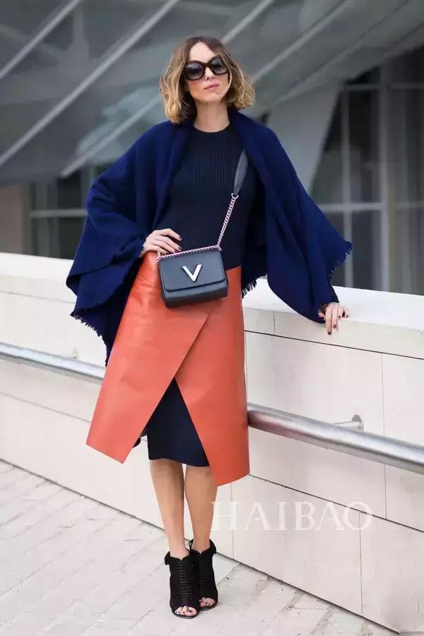 暖色披肩再加上宝蓝梦露麻椒鞋,和包包完全呼应!