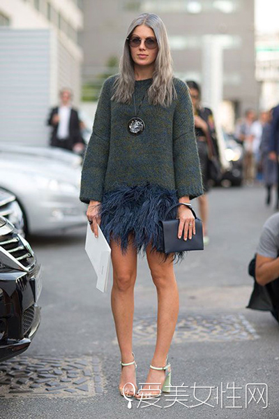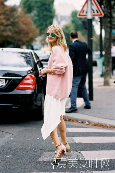 搭配技巧:宽身毛衣+不规则下摆裙子+矮跟凉鞋