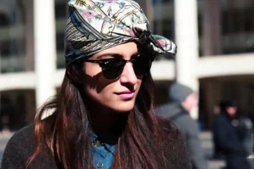 1、将复古丝巾绑在头上,再配上休闲的穿搭,个性复古范既显!