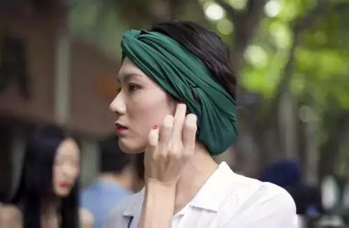 3、同样是在头上,但绑法儿和前面的稍微不同,可以选择纯色的或者是有花色的,以额头和脑后下部分为一圈,再配上精致的复古妆容,轻松简便。