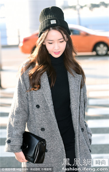 林允儿戴黑色毛线帽搭配黑色毛衣、灰色大衣,利落大气