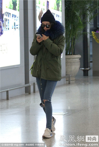 唐嫣戴纯黑色毛线帽,跟黑色打底裤呼应,全身颜色看起来很干净舒服