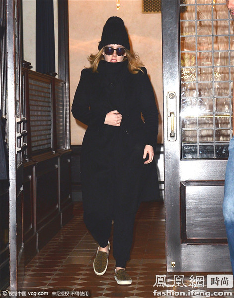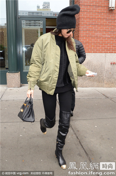 全身黑的造型搭配墨绿色帽子,也算是点睛一笔