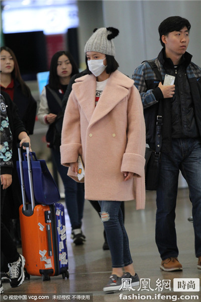 袁姗姗戴灰色毛线帽搭配粉色系大衣,颜色都比较淡,不会冲突