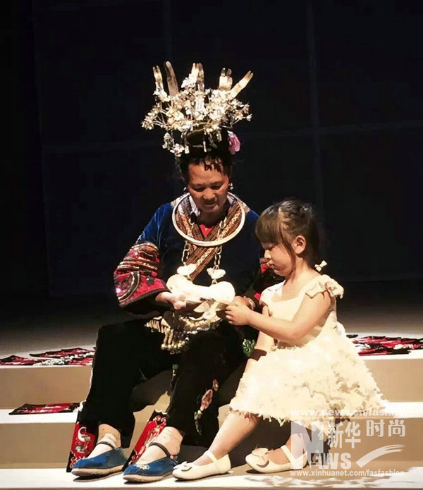 在广州大学发布秀前,进行了一场接近于行为艺术式的表演:一位身着民族服饰的绣娘带着一个小女孩在t台前进行刺绣。“我们之所以请来这位贵州的绣娘,是为了传达一个概念,希望我们能够拾起属于我们自己的传统和民意。”广州大学纺织服装学院服装艺术系主任刘会明在接受新华网采访时表示。