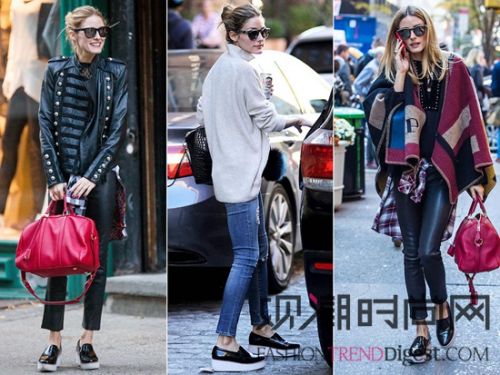 奥利维亚•巴勒莫(olivia palermo)本身就是高妹,可是依旧喜欢让自己看起来更高挑,脚上穿着白底黑色乐福鞋,裸露脚踝凸显骨感,黑色皮质运动风鞋子让美女们不仅高挑而且轻便舒适。