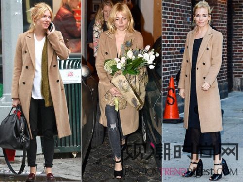 西耶娜•米勒(sienna miller)身穿浅棕色的过膝长大衣搭配黑色破洞牛仔裤彰显个性,换成黑色连衣裙则是多了几分韵味,柔媚的感觉散发典雅气质。