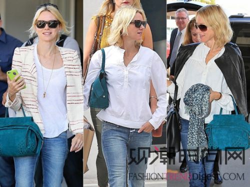 娜奥米•沃茨(naomi watts)白色的内搭与蓝色牛仔裤是天生一对,加上手里的麂皮蓝色手包是最清爽的搭配,拎着肩背都是不错的携带方式。
