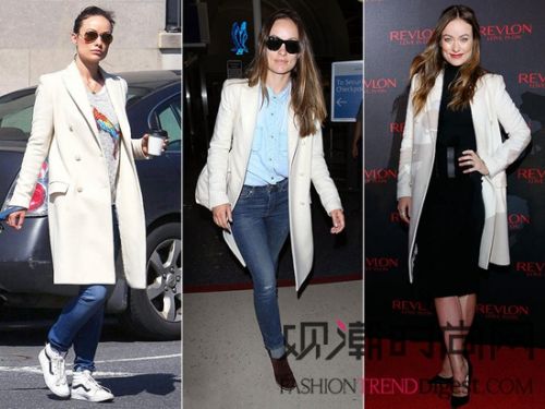 奥利维亚•王尔德(olivia wilde)白色Uniqlo的羊绒半大衣简约时尚,下身搭配蓝色牛仔裤就像学生一样。换成黑色连衣裙礼服搭配这件白色半大衣走红毯立刻有了明星范儿,脚上的尖头高跟鞋女人味十足。