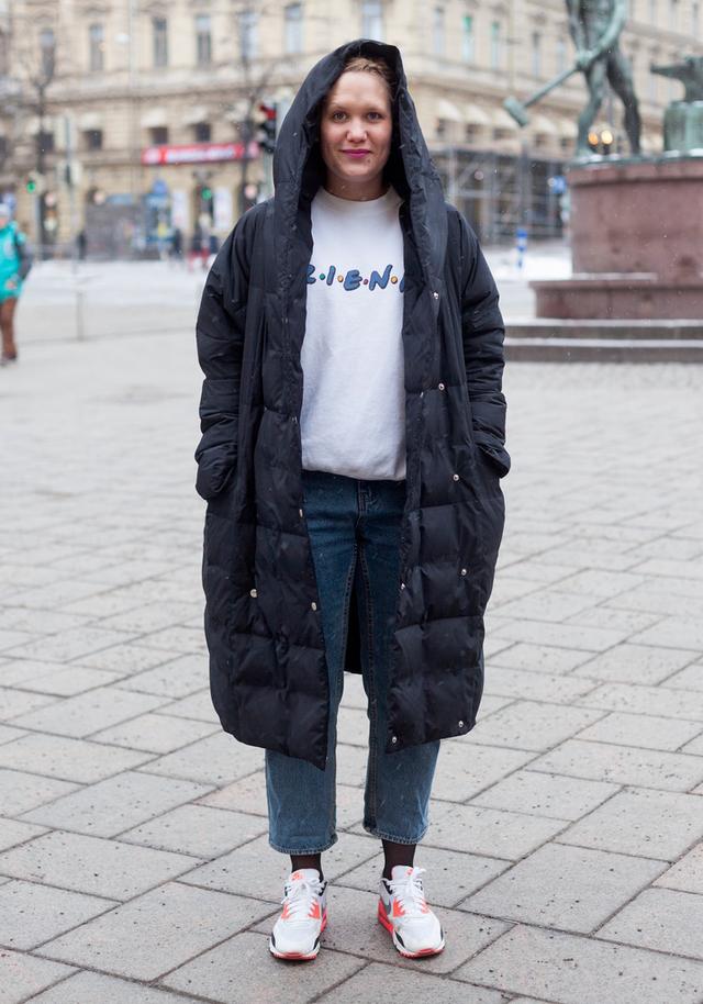 Tips6:羽绒服+连帽卫衣+驼色麂皮厚底鞋